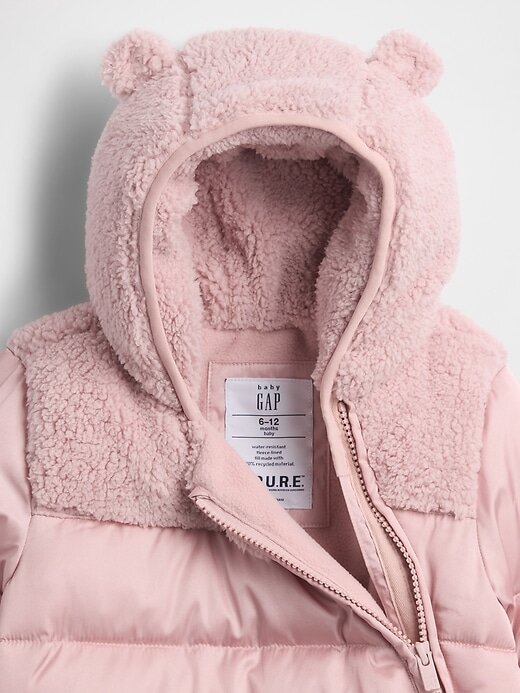 - Decote com capuz de sherpa e apliques de orelha de urso.