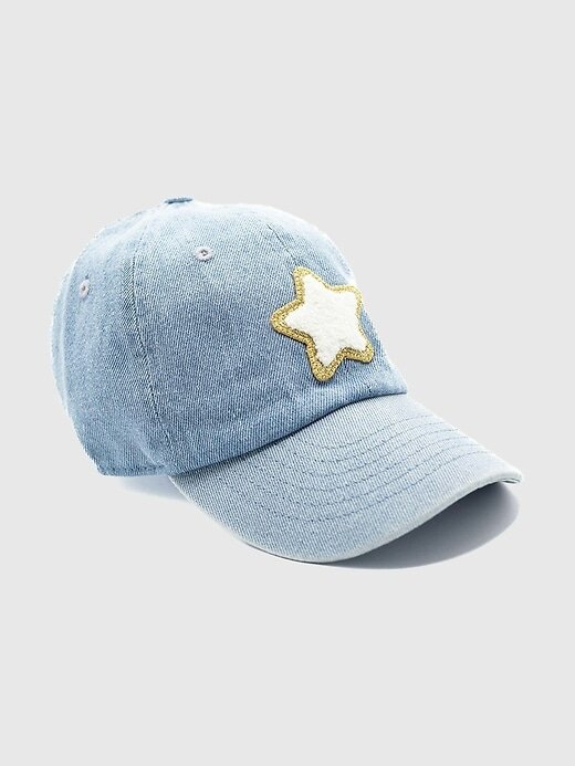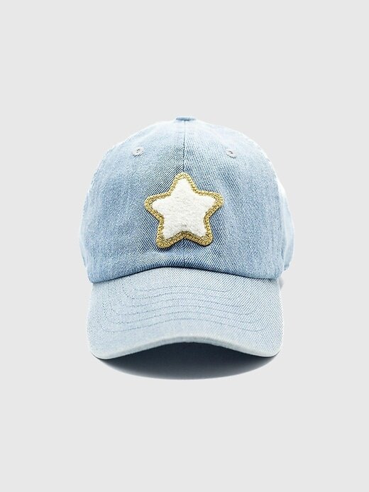 • Chapéu Star em tecido felpudo dourado com glitter jeans.