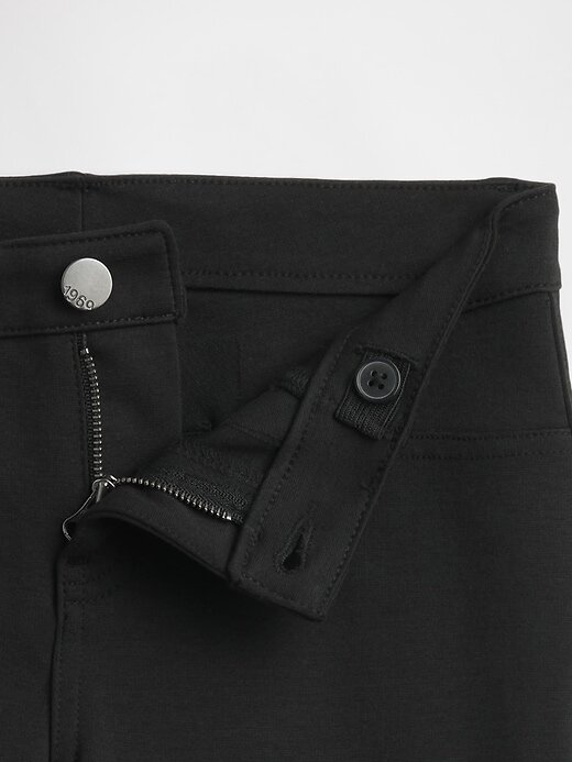 - Botão no centro da frente (os tamanhos 4 a 8 têm fecho de gancho e barra sob o botão de pressão falso para facilitar a colocação e retirada), braguilha com zíper.