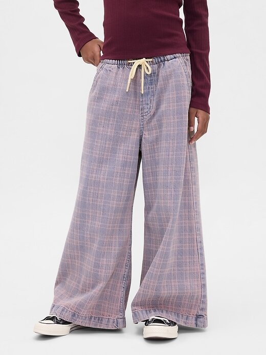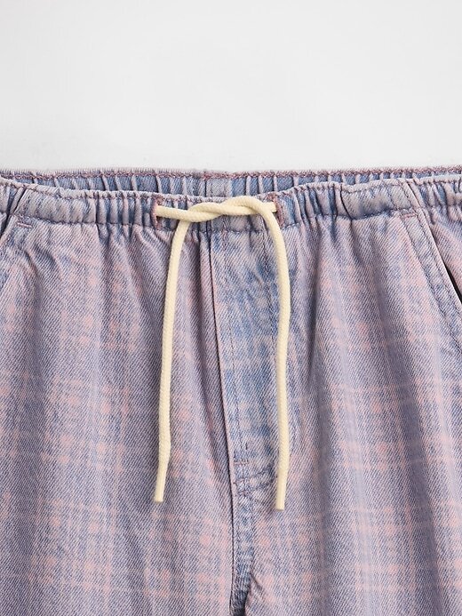 - Cintura elástica com cordões e braguilha falsa.