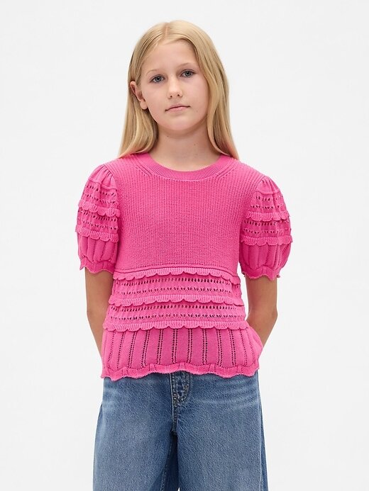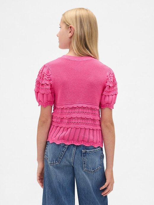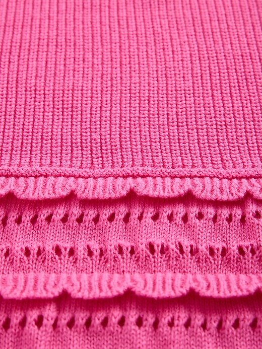 - Detalhe de malha recortada em camadas nas mangas e na bainha inferior.