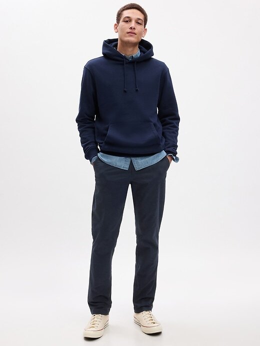 - A modelo tem 6’2″/74 cm com cintura de 32″/81 cm e veste tamanho regular da Gap 32×32.