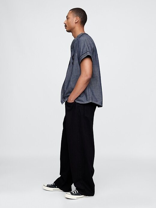 • As modelos têm 1,85 a 1,88 m (6’1″–6’2″), cintura de 79 cm (31″) e entrepernas de 81 a 84 cm (32 a 33″) e estão usando o tamanho M da Gap.