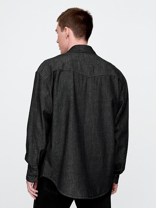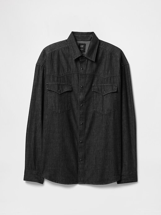 - Costura estilo western e bolsos de aplicação com aba no peito.