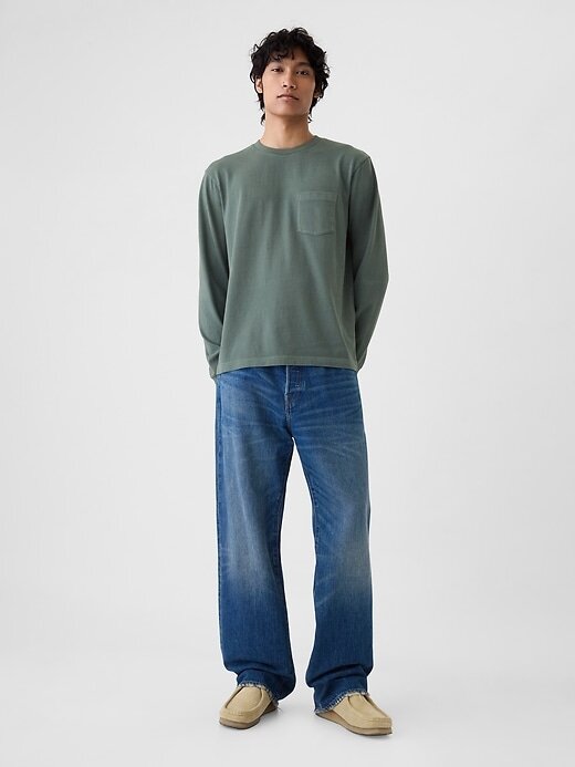 • As modelos têm 1,85 a 1,88 m (6’1″–6’2″) com cintura de 79 cm (31″) e costura interna de 81 a 84 cm (32 a 33″) e estão usando tamanho M da Gap.