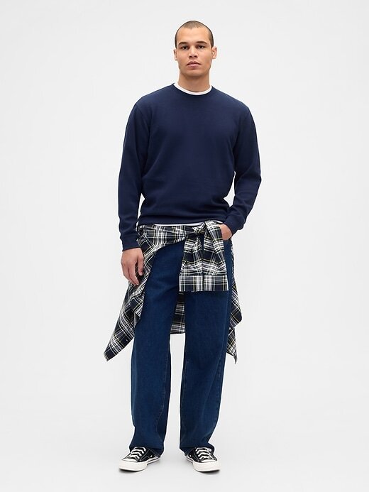 • Os modelos têm 1,85 a 1,88 m (6’1″ a 6’2″) com cintura de 79 cm (31″ e 32–33″ (81 cm–84 cm) de costura interna e está usando tamanho M da Gap.