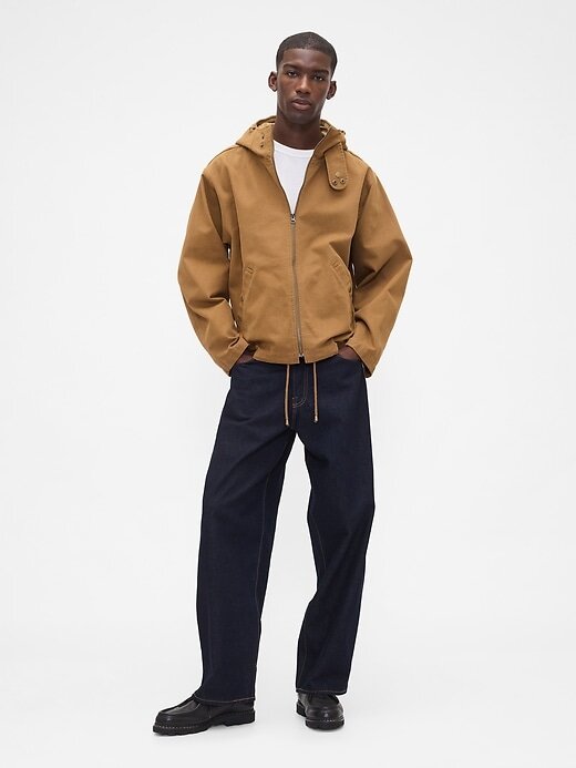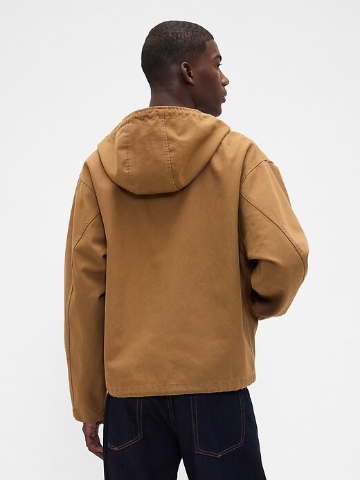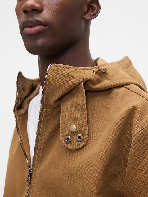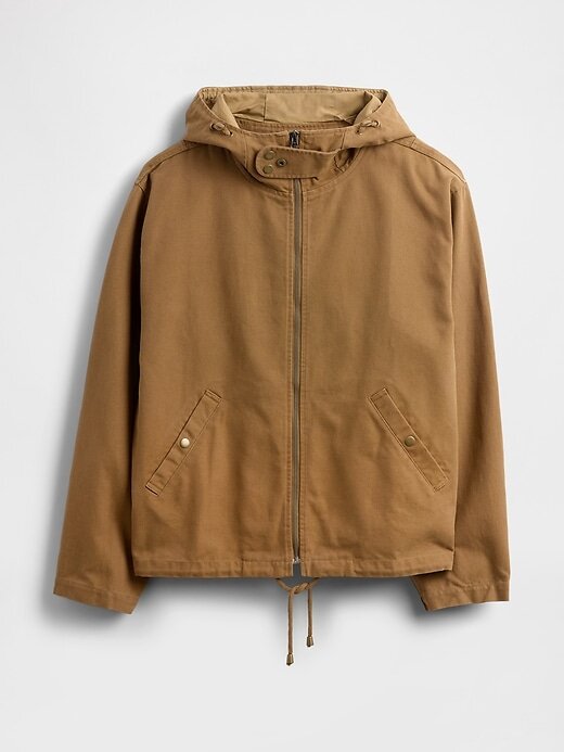 • Jaqueta com capuz e zíper em lona de algodão lavado.