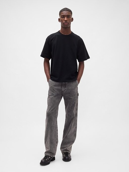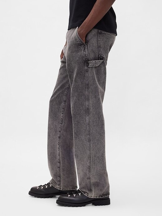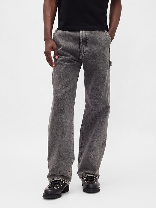 - Visual: Um jeans carpinteiro clássico em uma lavagem lilás empoeirada.