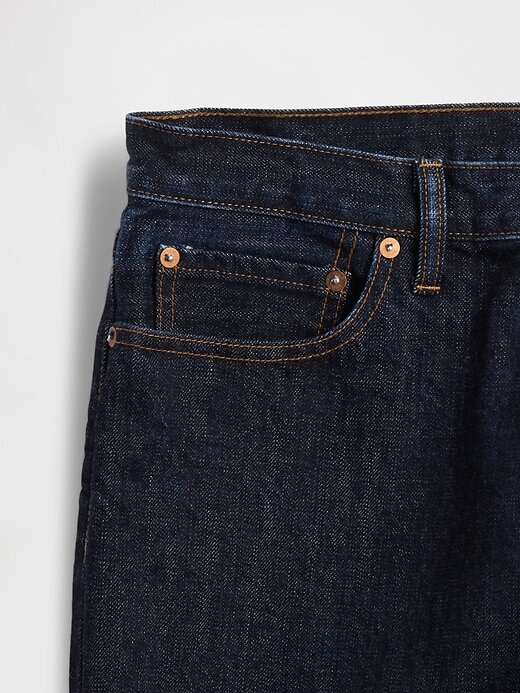 - Visual: Um jeans de cinco bolsos com lavagem escura.