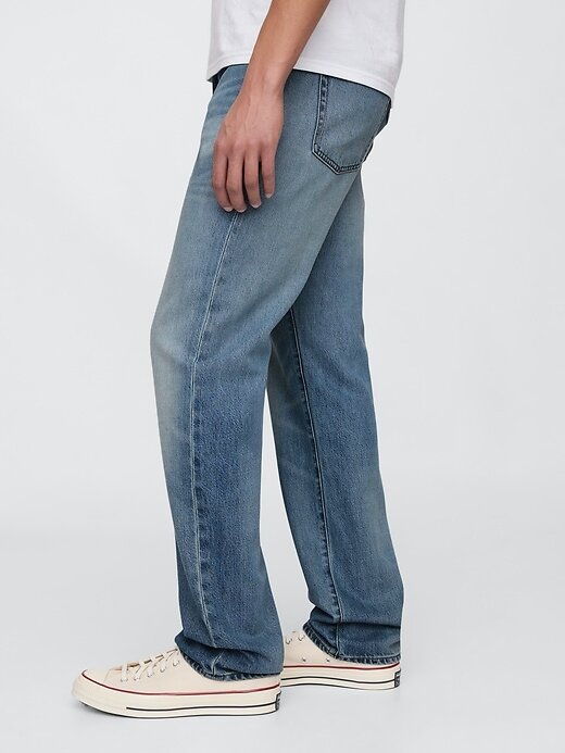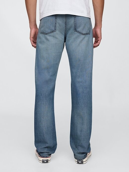 - Visual: Um jeans de cinco bolsos com lavagem média.