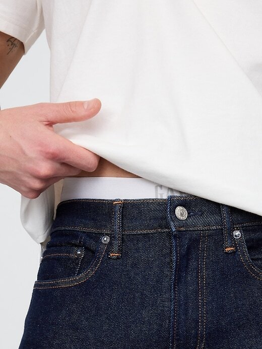 - Visual: Um jeans clássico de cinco bolsos com enxágue de resina.