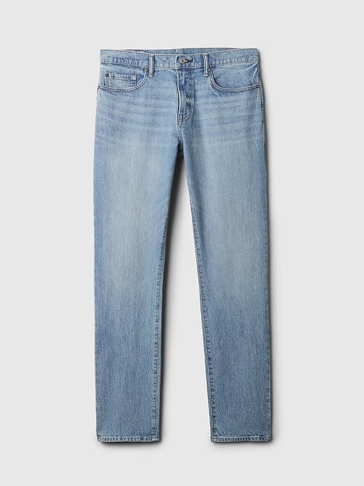 - Visual: Um jeans clássico de cinco bolsos em uma lavagem índigo clara.