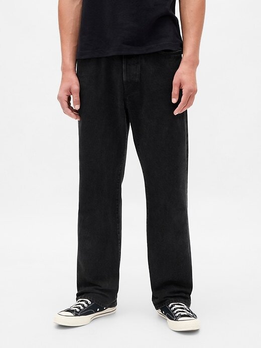 - Visual: Um jeans clássico de cinco bolsos em uma lavagem preta.