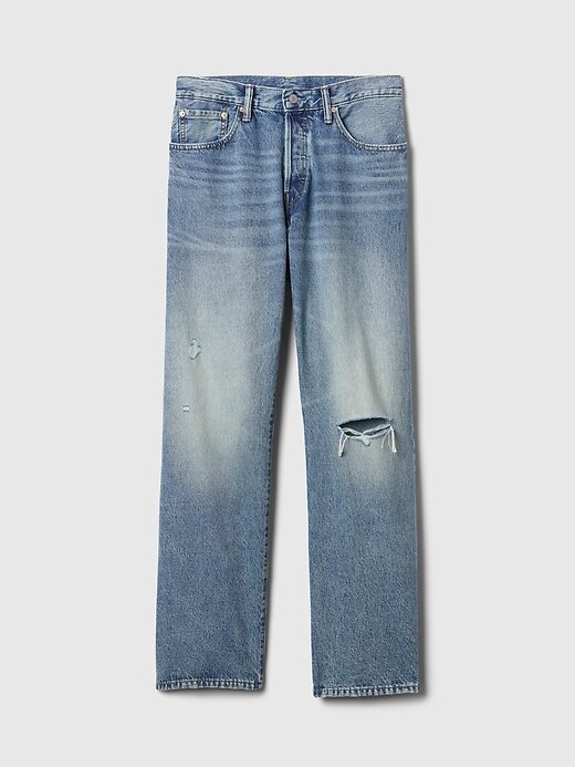 - Visual: Um jeans desgastado de cinco bolsos em uma lavagem média com desbotamento e ondulação.