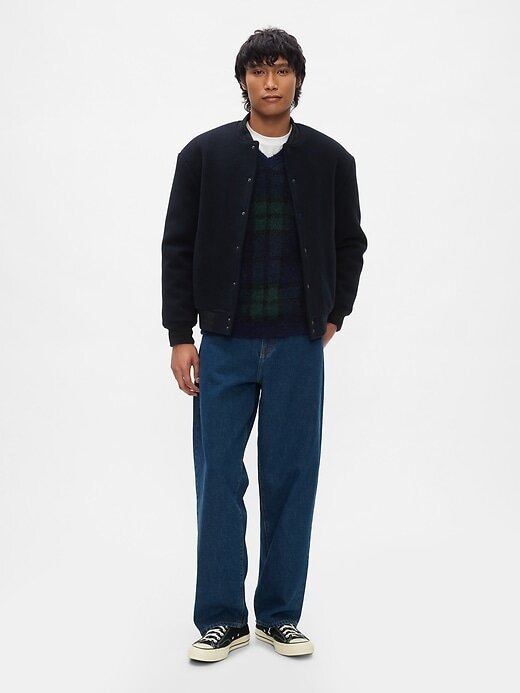 - Os modelos têm 1,85 a 1,88 m (6’1″ a 6’2″) com cintura de 79 cm (31″) e costura interna de 81 a 84 cm (32 a 33″) e estão usando o tamanho M da Gap.