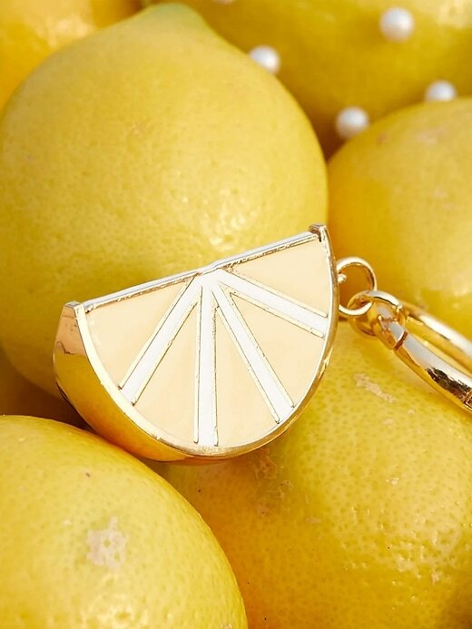 - Adicione um toque de amor por limão à sua bolsa com este pingente de saco em forma de fatia de limão espremido na hora.