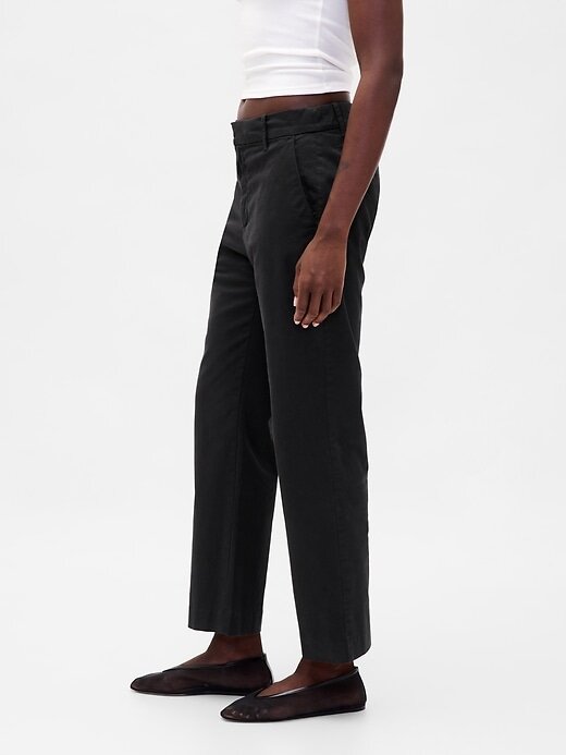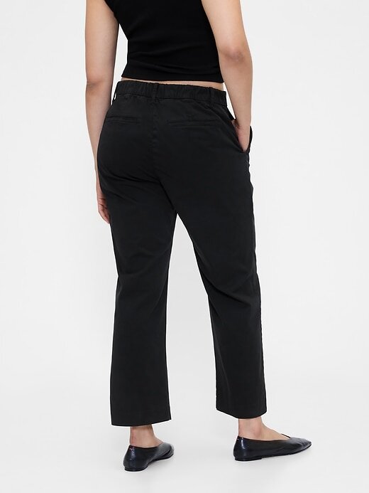 - Calça cáqui reta de algodão elástico e macio, na altura do tornozelo.