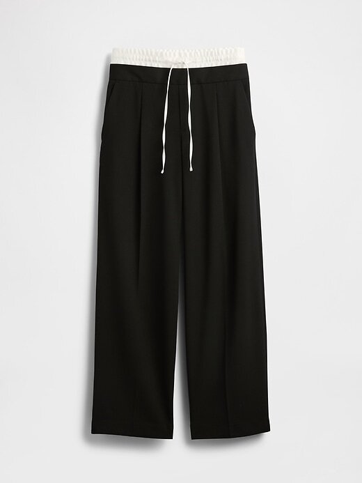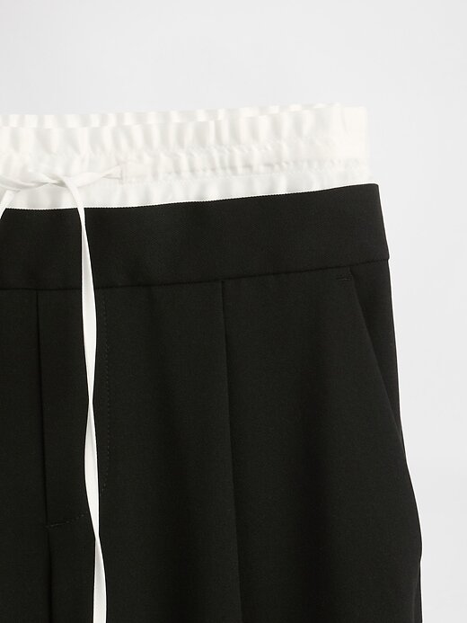 - Faixa superior elástica e cós inferior com costura, cordões e braguilha falsa.