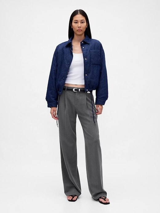 - Cintura elástica com fecho de gancho e barra ocultos, braguilha com zíper.