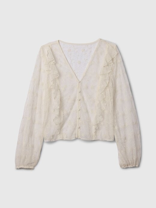 - Camisa de renda transparente com babados sem forro.