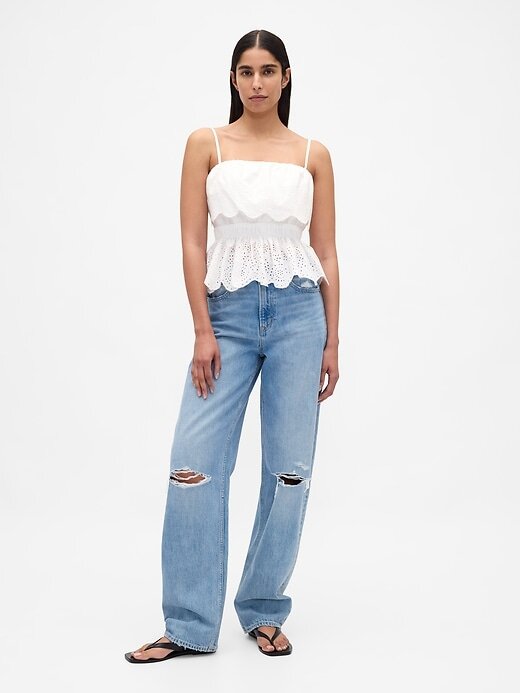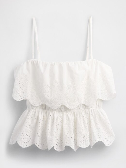 - Gola quadrada com babado de ilhós recortado na frente e atrás.