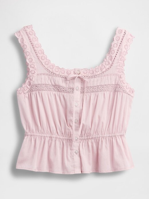 - Decote quadrado com acabamento em renda recortada e detalhe de amarração na frente.