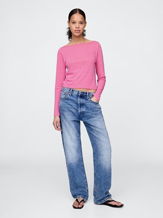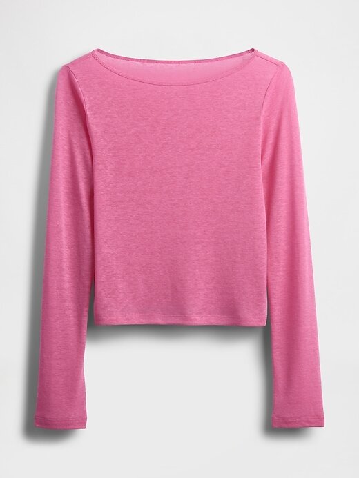 - Camiseta curta em jersey macio com mistura de linho.