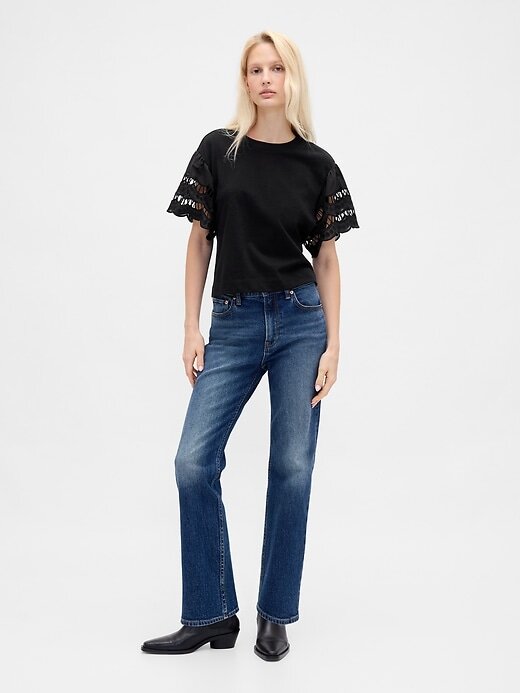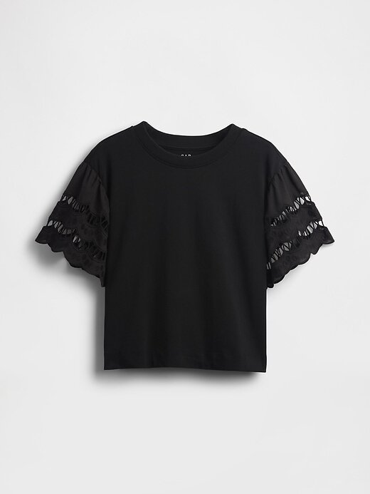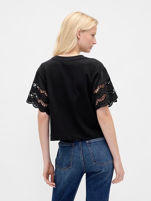 • Mangas curtas recortadas com detalhe de recorte em ilhós.