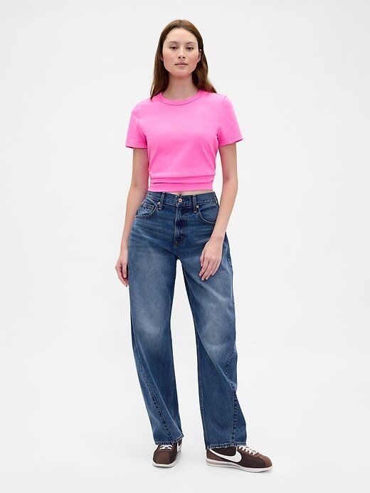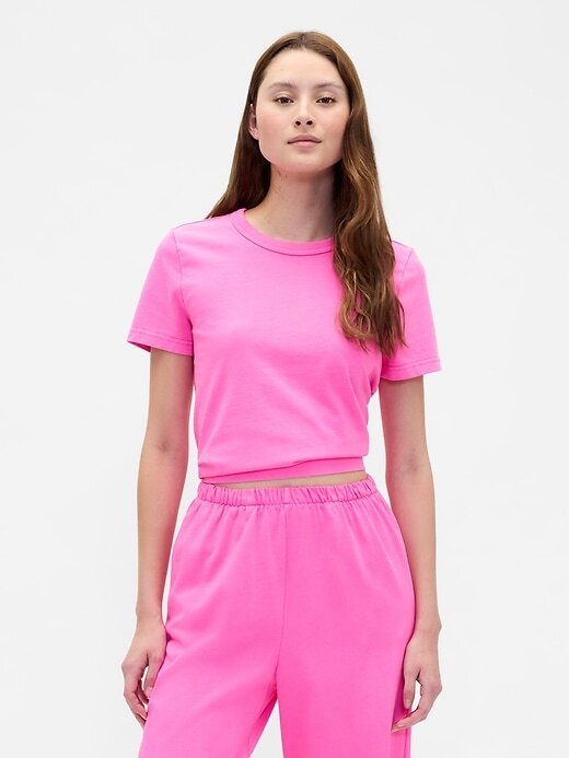 • Camiseta de algodão macio e pesado. Em um ajuste encolhido e ligeiramente curto.