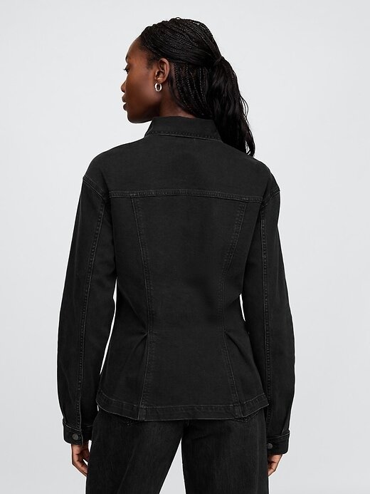 - Jaqueta jeans peplum com pouca elasticidade.