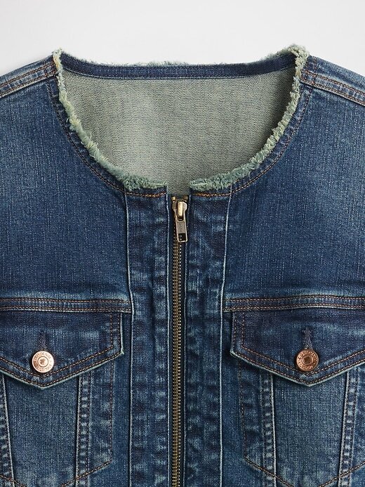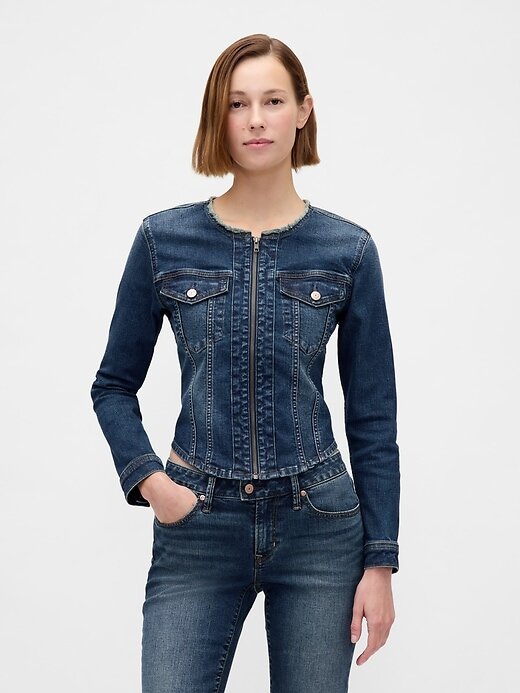 - Jaqueta motociclista jeans com elasticidade baixa. Em corte cropped.