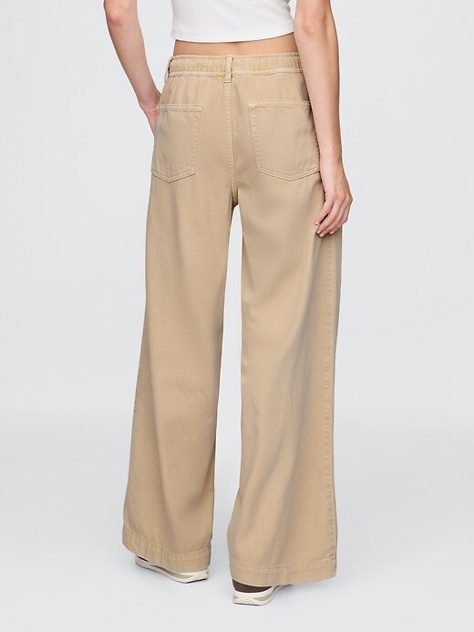 - Visual: Um jeans largo e fácil de vestir em uma lavagem bege.