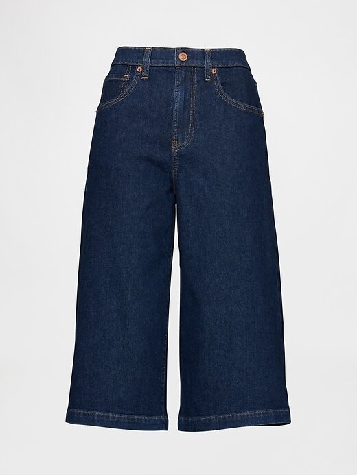 - Visual: Jeans culote de cinco bolsos em lavagem azul-escuro índigo.