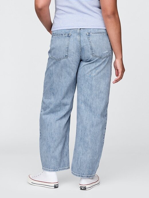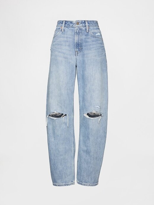 - Ajuste: Um jeans longo e largo, ajustado na cintura, com perna relaxada e tornozelo afunilado.