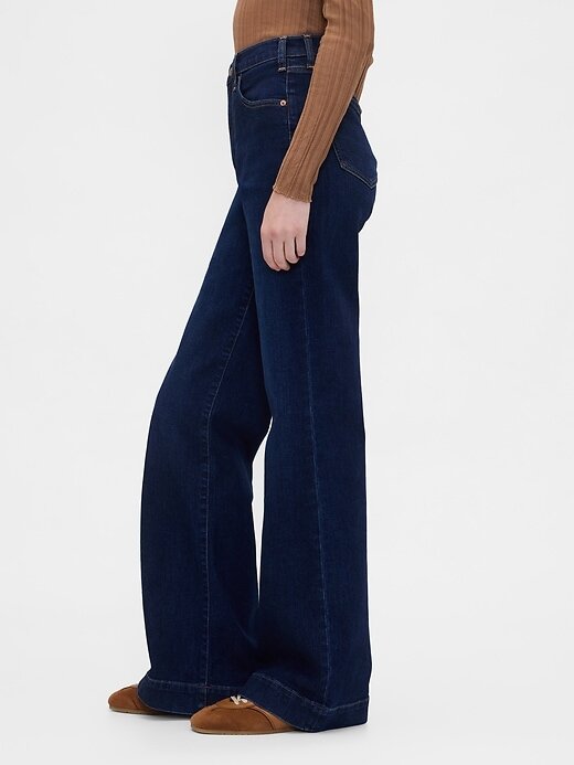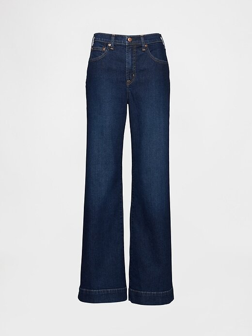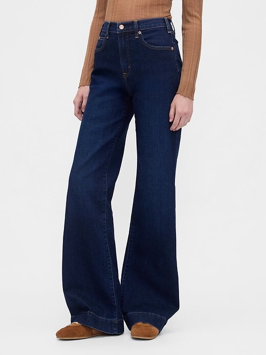 - Visual: Um jeans largo de cinco bolsos em uma lavagem escura.