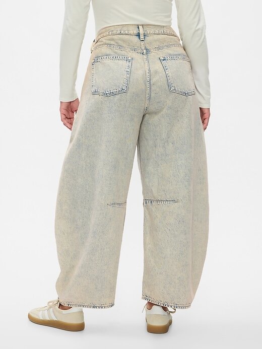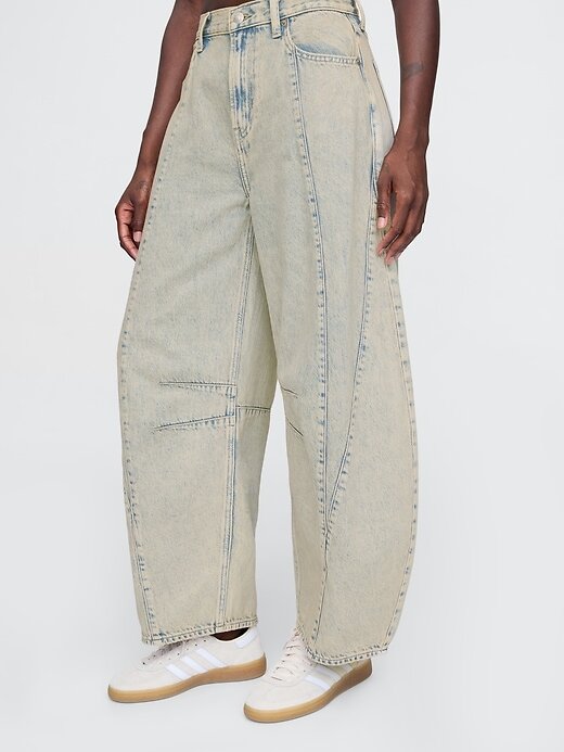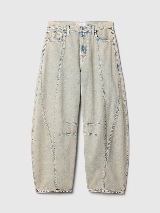 - Caimento: Um jeans estilo ferradura na altura do tornozelo, ajustado na cintura, com perna curva exagerada e tornozelo afunilado.