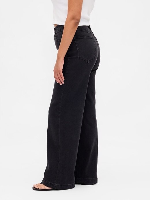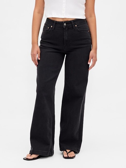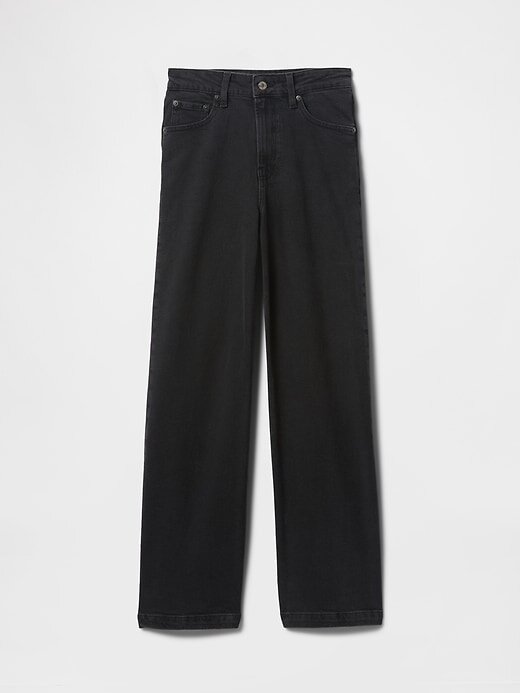 - Visual: Um jeans solto de cinco bolsos em uma lavagem jeans preta.