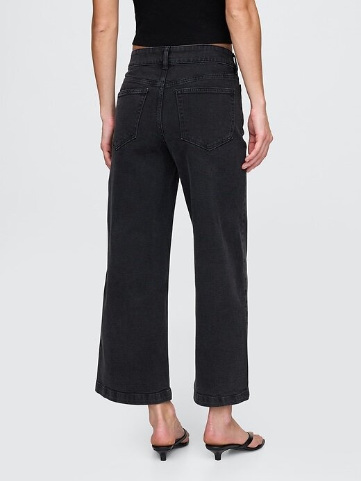- Visual: Jeans com quatro bolsos no tornozelo em uma lavagem preta.