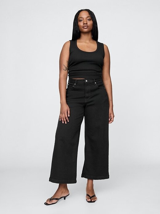 Calça jeans larga de cintura alta com strass e perna larga