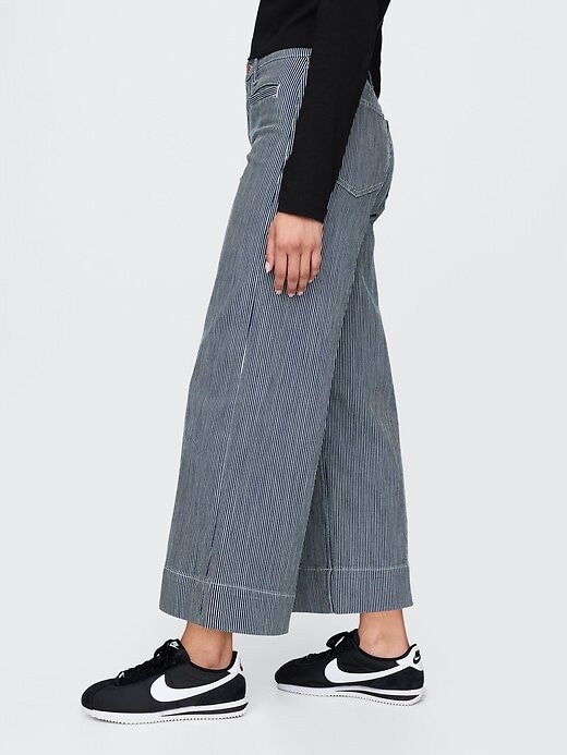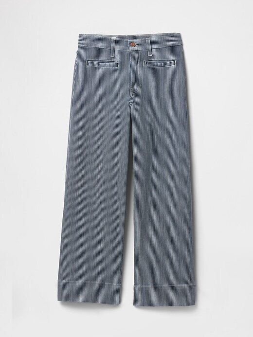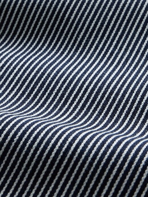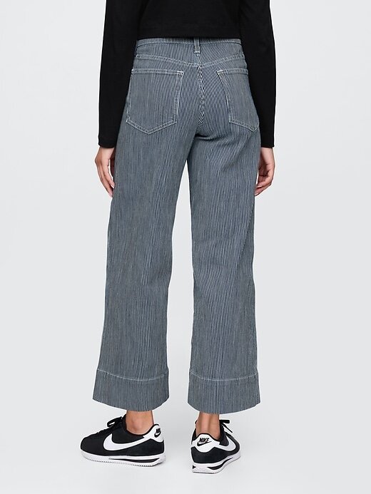 - Visual: Jeans de cinco bolsos no tornozelo com lavagem de listras ferroviárias azuis.
