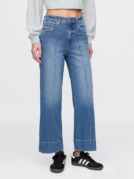 • Visual: Jeans de cinco bolsos no tornozelo em uma lavagem índigo média.
