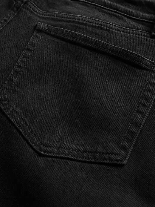 - Visual: Um jeans clássico de cinco bolsos em uma lavagem preta.