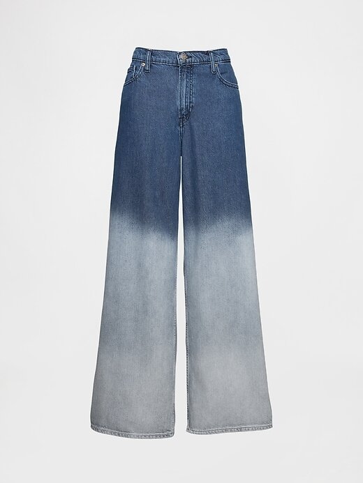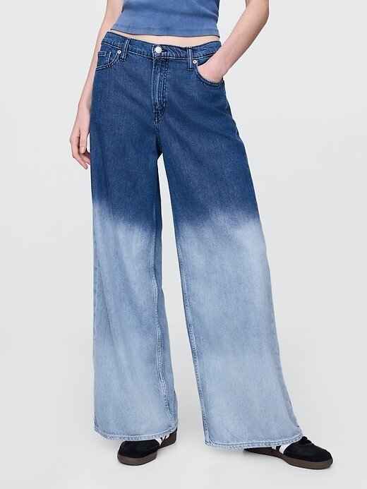 - Visual: Um jeans largo de cinco bolsos em uma lavagem índigo média.