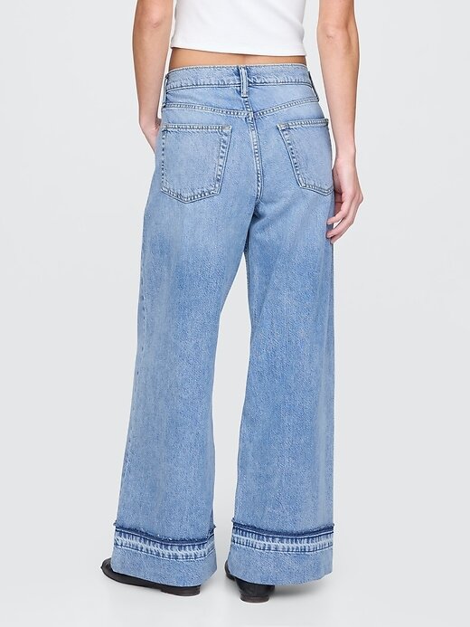 - Visual: Uma calça jeans larga com lavagem índigo média.