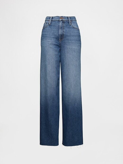 - Visual: Uma calça jeans larga de cinco bolsos com lavagem índigo média.