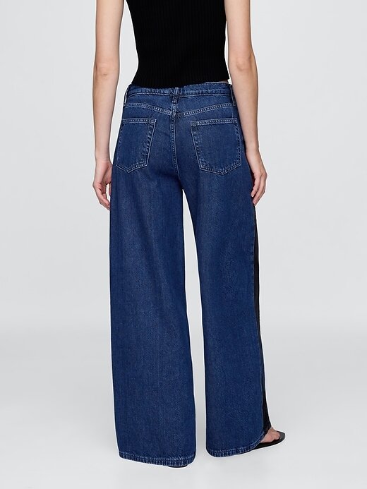- Visual: Um jeans largo de cinco bolsos em lavagem escura com listras laterais.