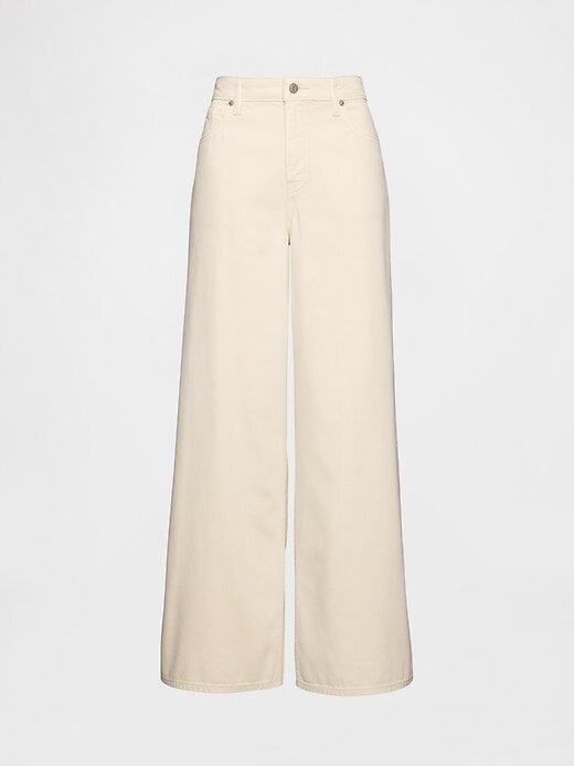 - Visual: Jeans largo de cinco bolsos com lavagem bege cru.