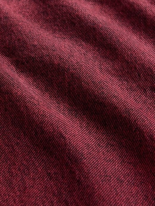 - Visual: Um jeans reto clássico de cinco bolsos em uma lavagem vermelha.