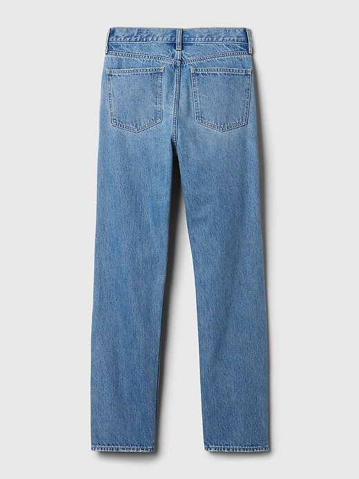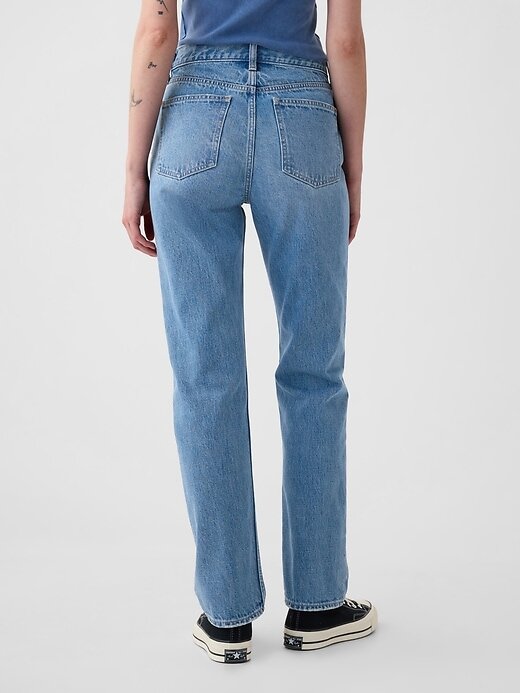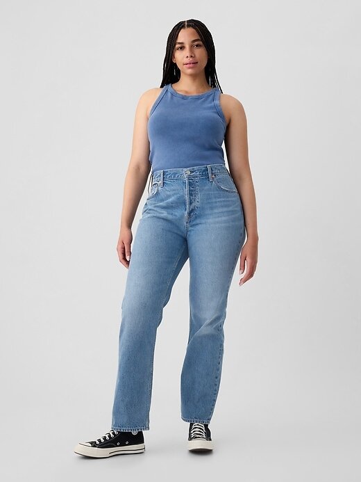 - Visual: Um jeans reto clássico de cinco bolsos em uma lavagem índigo média.