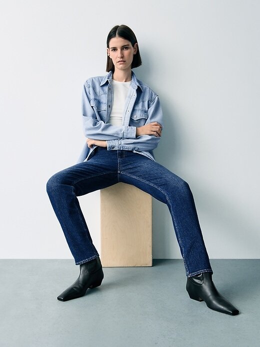 - Ajuste: Um jeans clássico de perna reta e comprimento total, justo no quadril e na coxa.